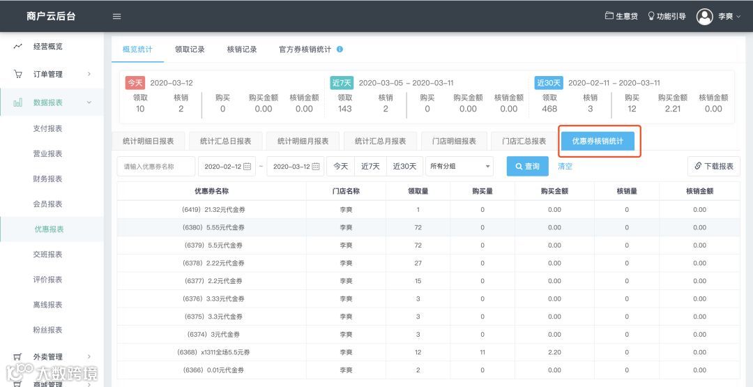 优惠报表增加优惠券核销统计,可以按券维度统计数据