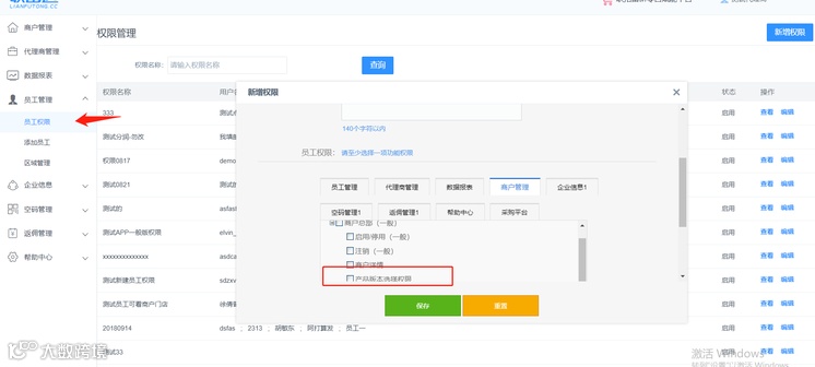 权限管理增加产品版本选择权限,目的控制创建商户/门店时允许开通联拓富基础版以外的版本权限,若不勾选,则只允许代理商创建商户/门店时开通联拓富基础版且编辑商户/门店时不能变更产品版本。