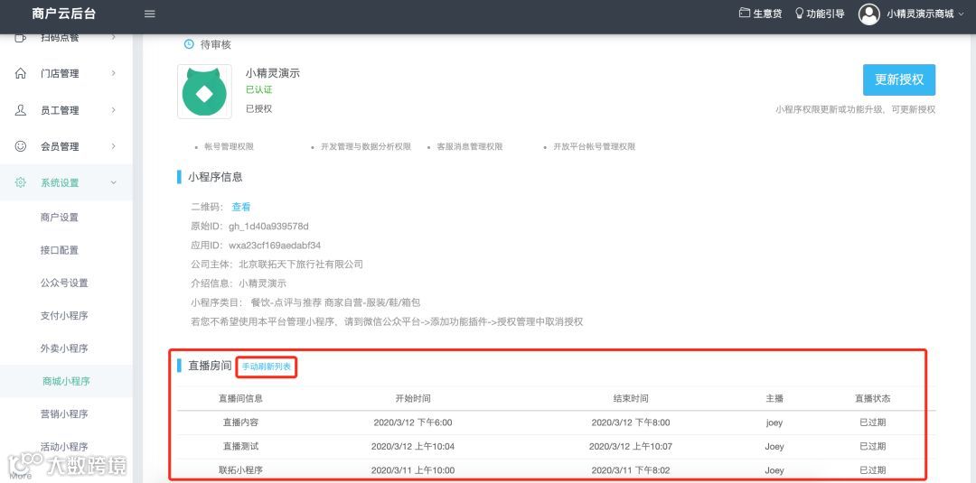 已开通小程序直播能力的商户,在小程序官方后台创建直播间,可以在商户后台小程序管理页面,看到直播房间的列表。因官方直播间接口获取1天500次的限制,我们做了缓存处理,每次在官方后台创建了直播间内容,需要在商户后台手动刷新一下。