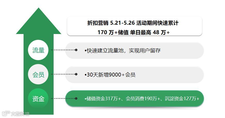 通过短信营销告知商户实体卡马上作废,快速把老会员吸引到店,并切换成为电子会员。(大量获得电子会员 9000+)在通过会员消费可享受全场 9 折的活动,吸引大量用户储值。累计储值 317 万,沉淀资金率 40%,共计127 万。