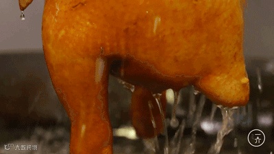 ▲ 腌制了45分钟的鸡被滚烫的热水淋皮,从而保证了鸡皮嘎嘣脆的气质。