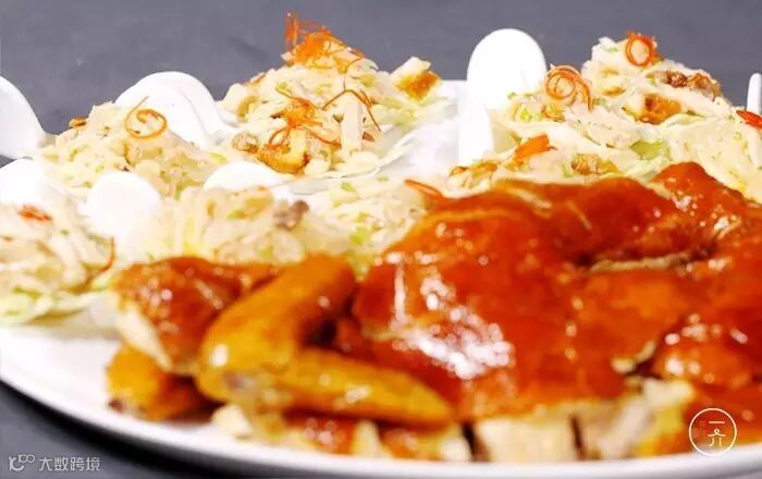 ▲ 细密的食盐撒在三黄鸡身上,充分提升鸡肉本身的鲜甜