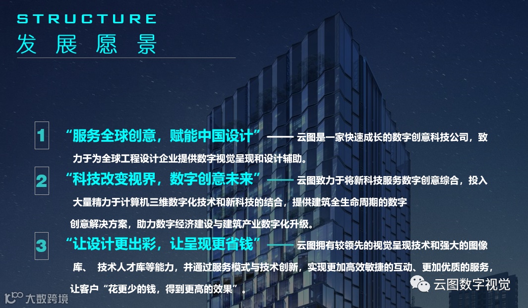 云图的核心业务是基于计算机三维数字化技术,提供多元数字化解决方案,并重点聚焦于为建筑工程的建设方、设计方和运营方提供全周期的数字创意综合服务。主要业务包括城市与企业数字可视化、数字创意互动、数字孪生、三维建筑可视化、BIM/ VR/AR +、建筑动态和静态表现(效果图)、多媒体与场景综合以及其他新型数字创意业务。创始团队有10年以上建筑工程与设计的从业经营,核心团队成员具有专业学科背景和深厚的技术能力。