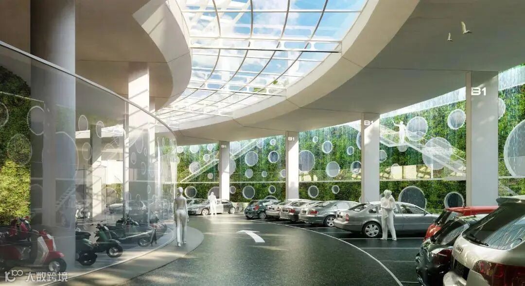 二楼部分还是公共区域,主要是办公室。三楼到六楼主要就是停车位了有160个电动汽车的停车位。七楼八楼就是休闲中心,设有健身房,水疗馆和游泳池。