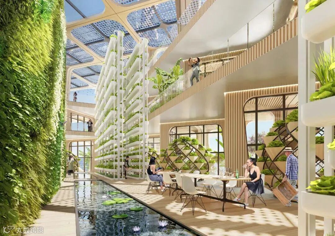 该项目采用多层的结构打造了一个绿色梯田的效果。这里除了水疗中心,还有配套的生活公共场所,像零售店这些。另外还有水培城市农场的屋顶餐厅。