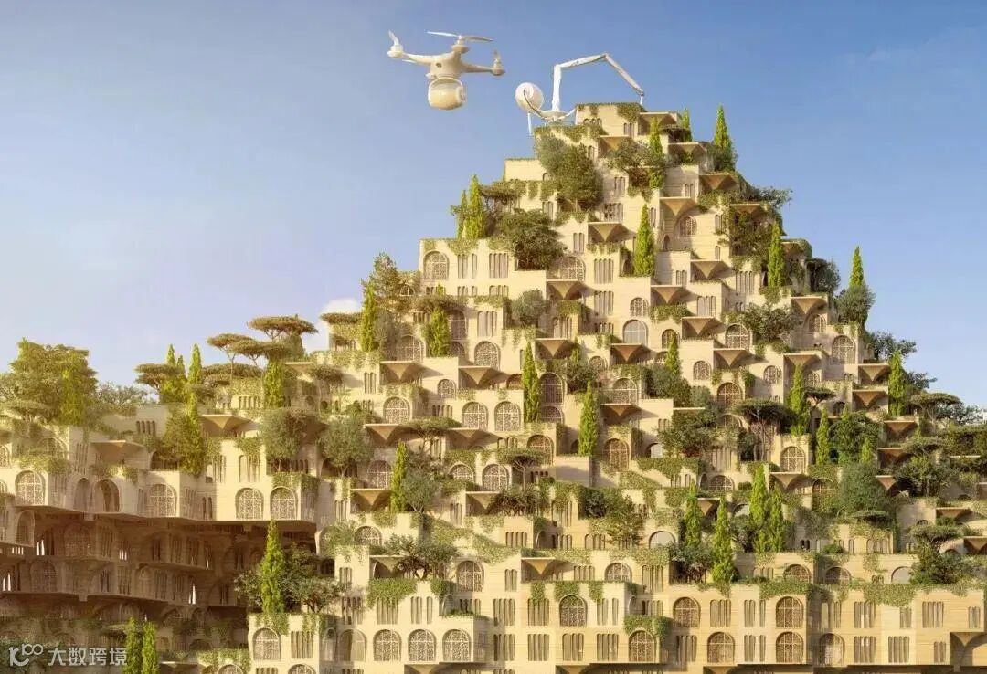 这个一个通过科技技术成果的城市规划模型,无人机和3D 打印机器人共同配合工作,将在战争中废弃的建筑材料通过无人机搬运,在通过3D打印机打印最终呈现了这个生态住所。
