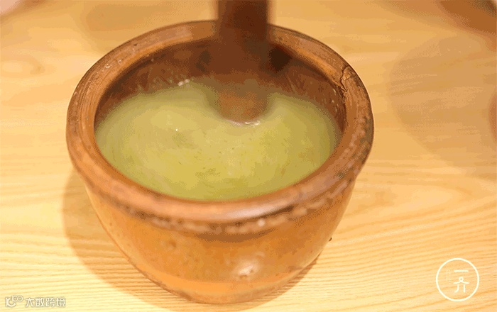 再添加250克的芝麻和少量的熟花生米到牙钵中,开始擂茶,直至被擂成浆糊状;