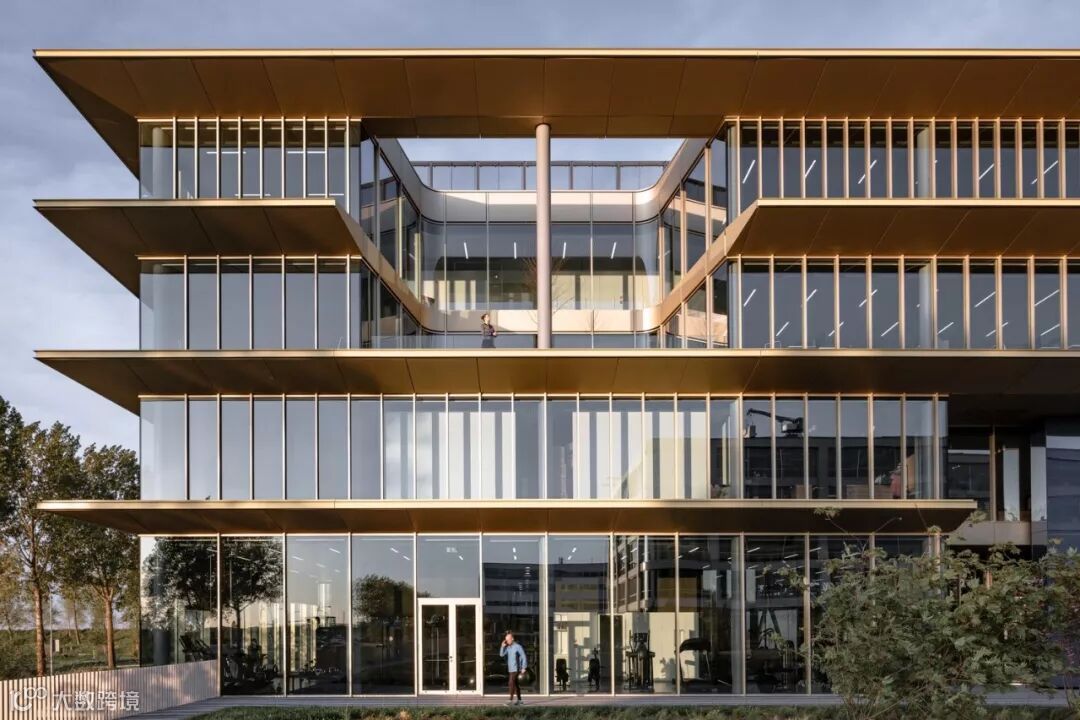 立面外围的金色钢翼突出部分,悬垂的存在塑造出独特的水平感,同时能遮蔽阳光。