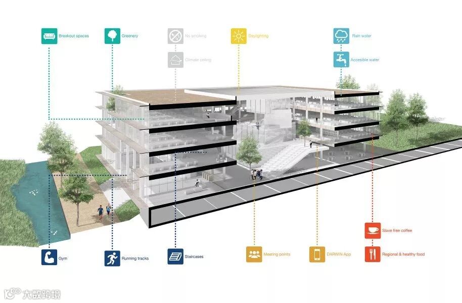 另外,建筑还按照 WELL Gold 和 LEED 金级认证的最健康、最具可持续性的标准进行建造,让建筑不仅能够节能、降水、降低 CO2 排放量,对环境友善,还可以通过这点来保证员工的健康。