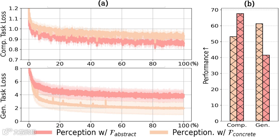 分层视觉感知分析:理解任务使用抽象粒度输入收敛更高效,生成任务使用具体粒度输入表现更好,验证了分层视觉感知的重要性(图 6:不同视觉感知的损失可视化和性能比较)。