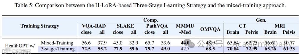 在CME 基准测试中,HealthGPT 不仅响应速度更快,而且在性能上优于现有的多 LoRA 架构。