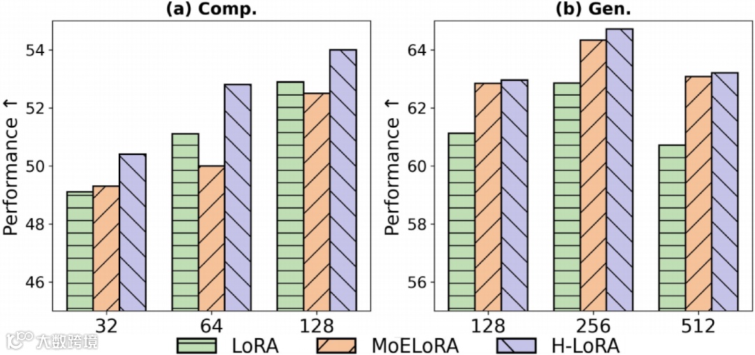 H-LoRA 的效果:H-LoRA 在多数理解任务和所有生成任务中性能出色,相比 LoRA 和 MoELoRA 优势明显,随着 LoRA 专家数量增加,其计算效率优势更突出。