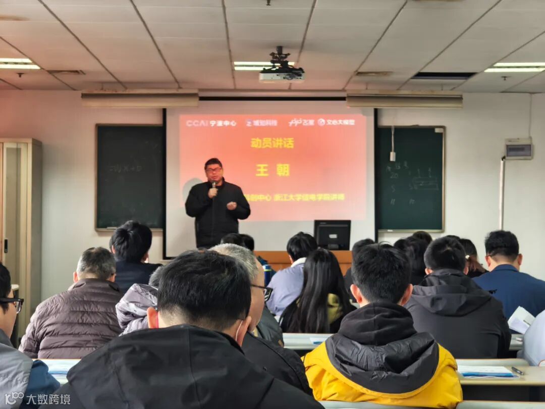浙江大学宁波科创中心、浙江大学信电学院讲师王朝,百度AI技术生态企业方向负责人段静慧,CCAI宁波中心(城知科技)常务副总周双健出席了开班仪式并致辞。