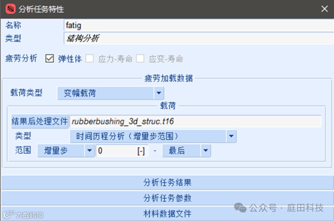 在此基础上,新增一个用于疲劳计算的分析任务,用于疲劳寿命计算。其计算设定参数如下图所示。其中,载荷类型采用变幅载荷,并选定前一步计算好的结果文件。定义好寿命计算的增量步范畴,该分析取第一步到最后一步的应变进行疲劳寿命计算。