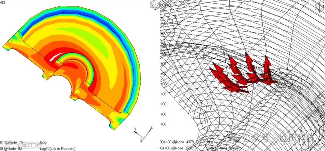 疲劳计算结果如下图所示,可以看到其损伤最大的位置在橡胶特征倒角处,最小对数寿命为2.7。这与前面计算的最大等效柯西应力位置对应。同时,还可以预测出橡胶裂纹开裂面,如下图所示。其中红色箭头所指的方向即为疲劳开裂平面的法向。