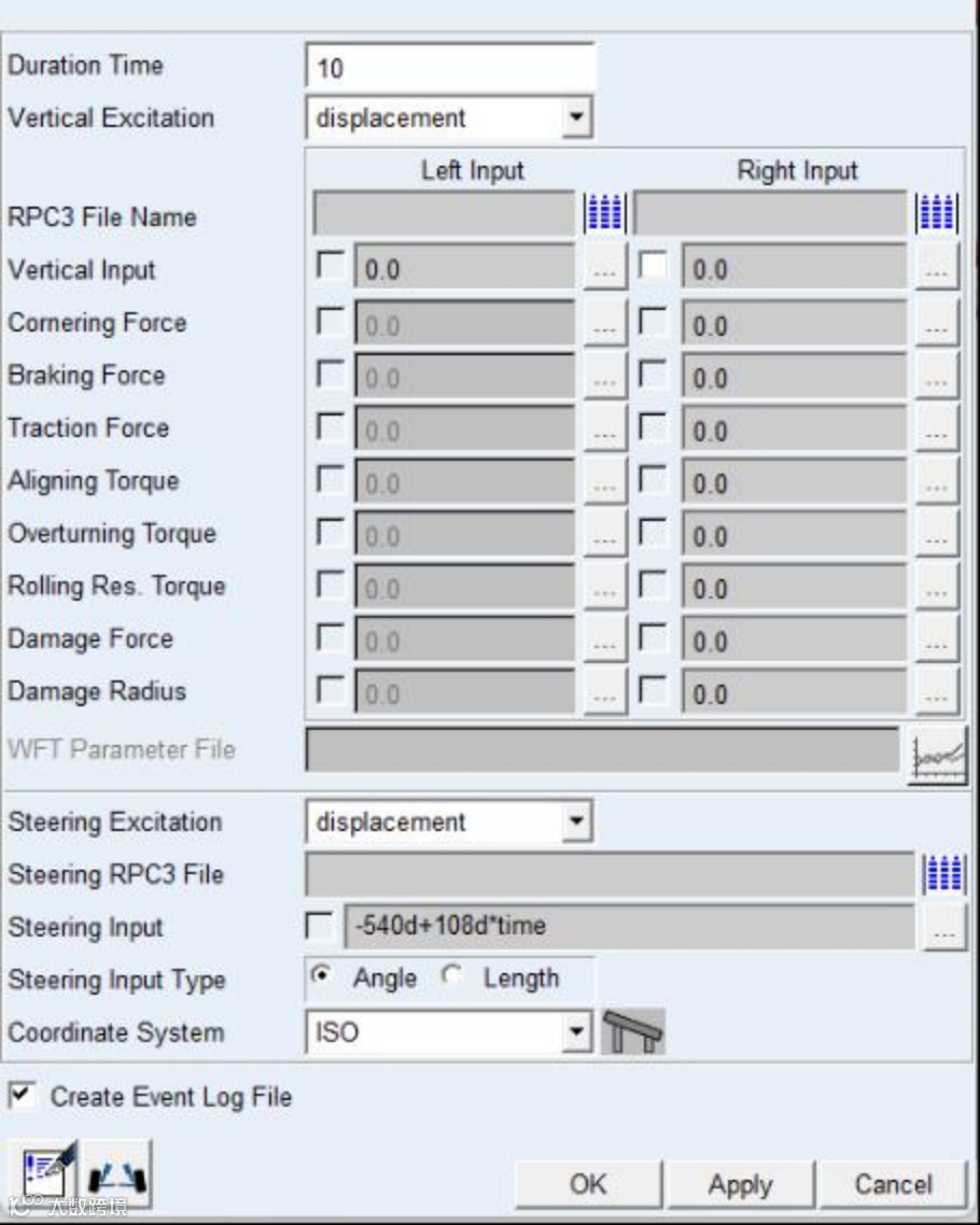在转向系统模板中,分别创建转向输入轴沿其轴线的角速度request(Wz_Steer_Input)和转向输出轴沿其轴线的角速度request(Wz_Steer_Output)。装配前悬架模型,将转向子系统模型设置为运动学(Kinematic Mode)模式。在菜单栏Simulate依次选择Suspension Analysis→Dynamic进入悬架动态仿真,Duration Time输入时间,Steering Excitation选择displacement或velocity,Steering Input输入方向盘转角或转速表达式。运行仿真。