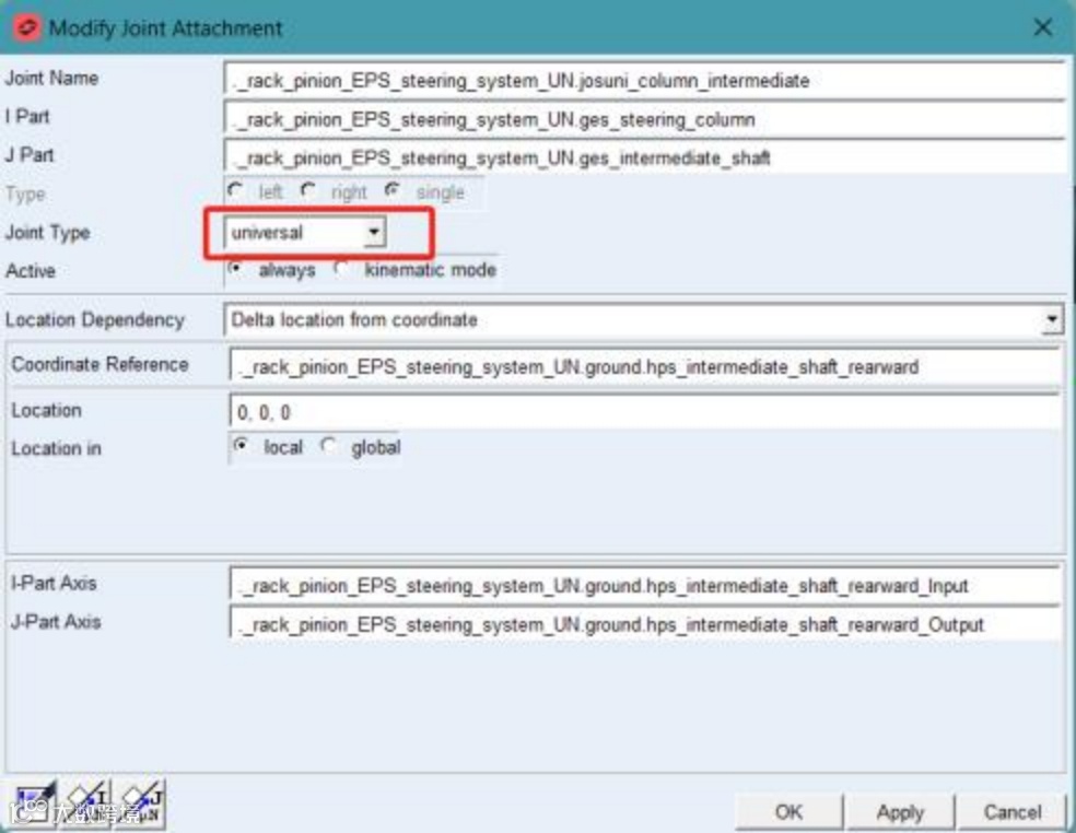 创建转向子系统时,十字万向节铰链类型使用universal定义。I Part选择与万向节主动叉固连的部件,J Part选择与万向节从动叉固连的部件。I-Part Axis选择十字轴主动叉参考方向点,该点与万向节中心点连线即为十字轴主动叉轴线;J-Part Axis选择十字轴从动叉参考方向点,该点与万向节中心点连线即为十字轴从动叉轴线。