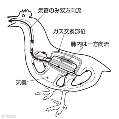 鸟类的“飞行”行为非常繁重,以至于需要大量的氧气。因此,鸟类的呼吸器官的结构与人类的器官完全不同。人体呼吸器官是一种往复式器官,它将空气从支气管送到肺部,然后再将其从体内排出。但是,对于鸟类,空气在肺内沿一个方向传播,因此可以连续交换气体(图4)。