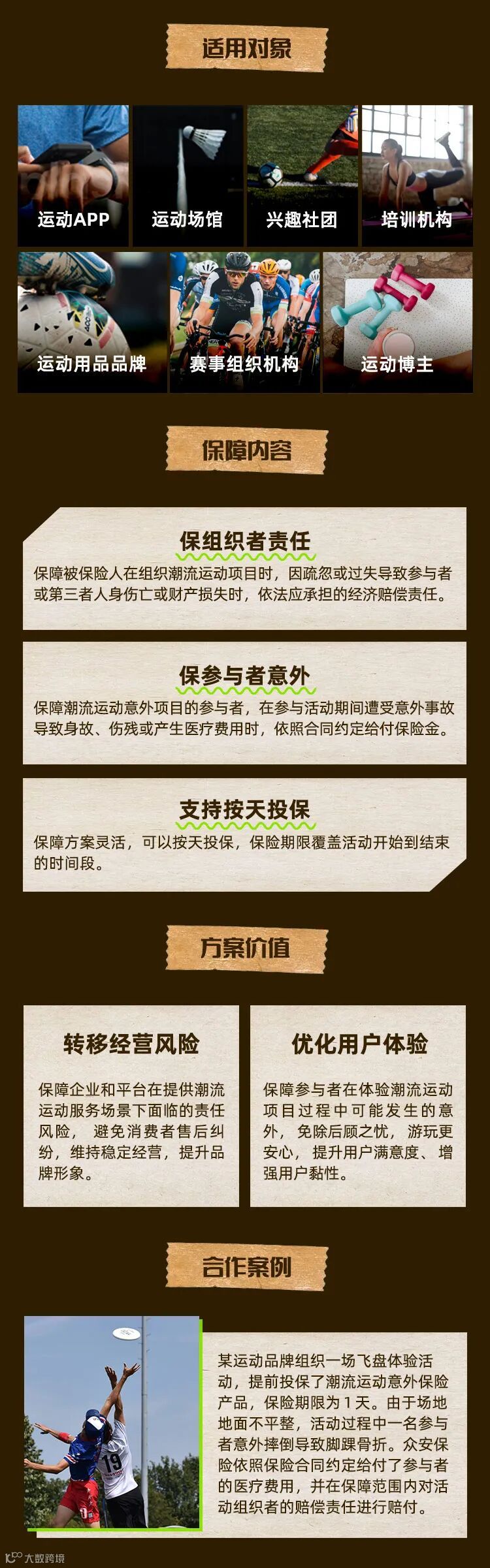 众安推出潮流运动意外保险解决方案,覆盖飞盘、滑板、自行车、徒步、溯溪、浆板、露营等多款潮流运动项目。有效保障参与者常见的运动意外风险,并保障活动组织者的赔偿责任。支持按天投保,保障方案灵活,让运动更安心~
