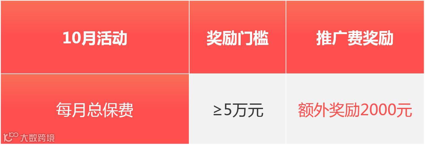 合作商户只需在10月总保费等于或高于5万元,即可获得额外奖励2000元