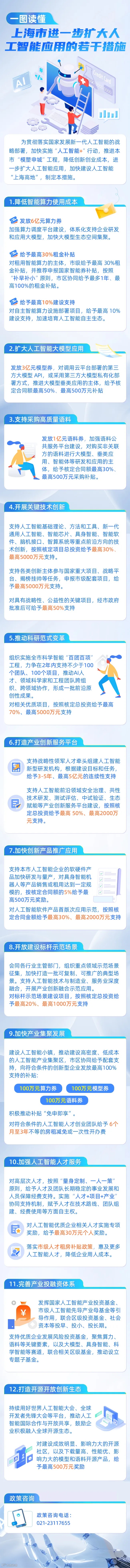 7月28日,上海市经济和信息化委员会发布《上海市进一步扩大人工智能应用的若干措施》。一次性推出6亿元算力券、3亿元模型券、1亿元语料券,并配套最高5亿元连续性资金、最高5000万元项目补贴等12条重磅举措,从算力、模型、语料等多个维度,全面加码人工智能产业集群建设,为人工智能企业发展提供有力支持。