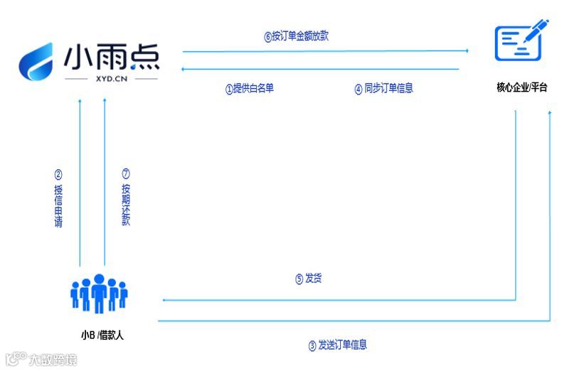 当核心企业的上下游商家满足一定数量,且与上下游商家的贸易往来频繁、健康,即满足与小雨点合作的条件。小雨点会以核心企业提供的上下游小微企业白名单为基础,以小微企业与核心企业发生的交易为依托,为特定小微企业及企业主提供资金支持,实现现款现货。