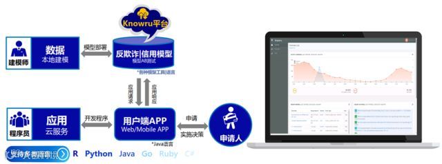 Knowru平台以API对接机构客户机器学习模型,在云平台专有环境中安全运行。2016年3月研发启动,覆盖全球多国客户(合作伙伴推荐),交易服务量300万/月。