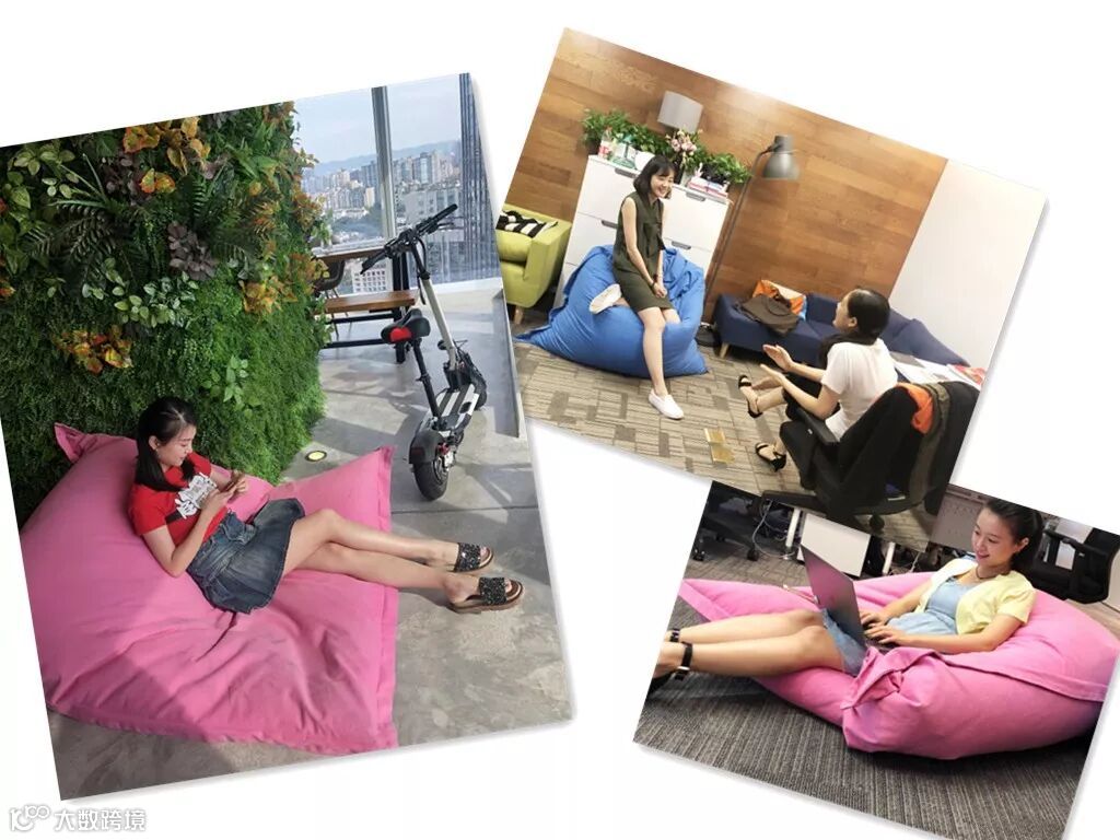 如果只有站立式办公桌当然不足够,小雨点还为员工配备了酷炫电竞椅、共享滑板车、感应游戏机、懒人沙发豆袋、放松按摩椅、娱乐机麻桌、秘密花园电话亭、乒乓球台、健康瑜伽班等等。
