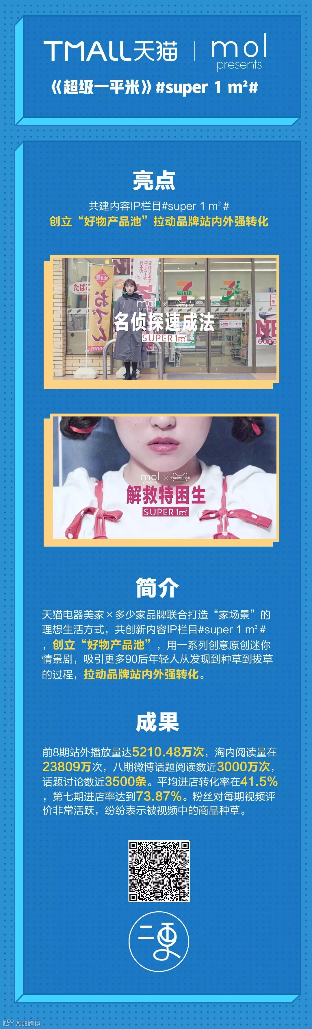 天猫作为世界领先的新零售平台各类营销节点层出不穷,流量巨大,但缺少鲜明的内容IP。为此,天猫电器美家联合多家品牌与二更传媒打造共创新的内容IP栏目#super 1 m²#,通过聚合短视频、专刊等优质内容形态,来诠释90后年轻群体更具象的理想生活场景。