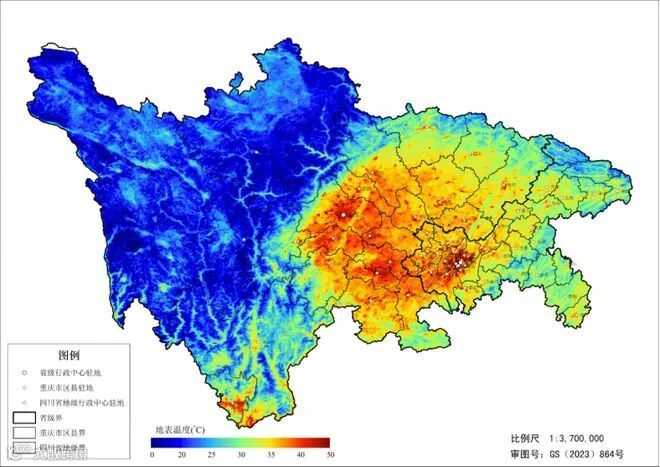 ▲示意图——2023年夏季川渝地表气温区域分布图