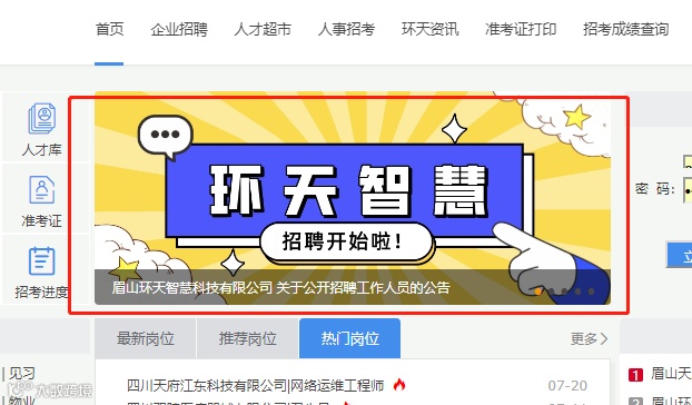 或者点击眉山环天人才菁英网“http://www.htrc114.com/”首页幻灯片进入。