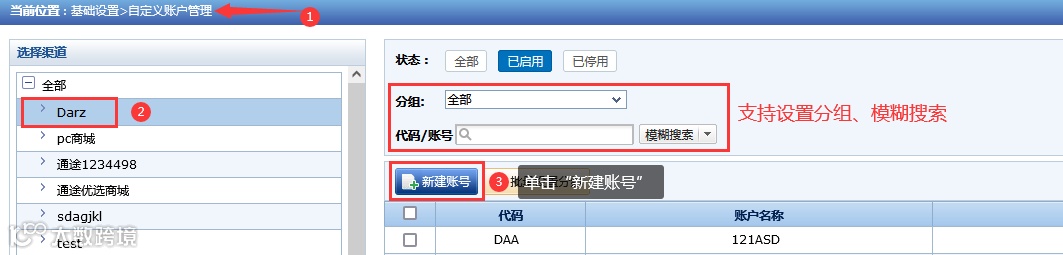路径:基础设置 → 自定义渠道 → 账户管理 → 选择渠道 → 新建账号