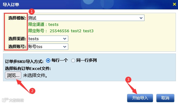 选择对应「模板」「渠道」「账号」,上传订单Excel文件,点击「开始导入」即可完成同步。