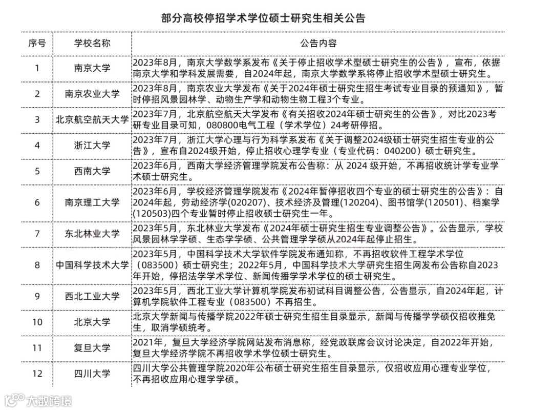 而这早已不是学硕停招的首例,2024年,大连理工大学建筑与艺术学院发布公告,城乡规划学专业停止招收博士研究生、硕士研究生(学硕)。南京大学数学系自2024年起停止招收学术型硕士研究生。