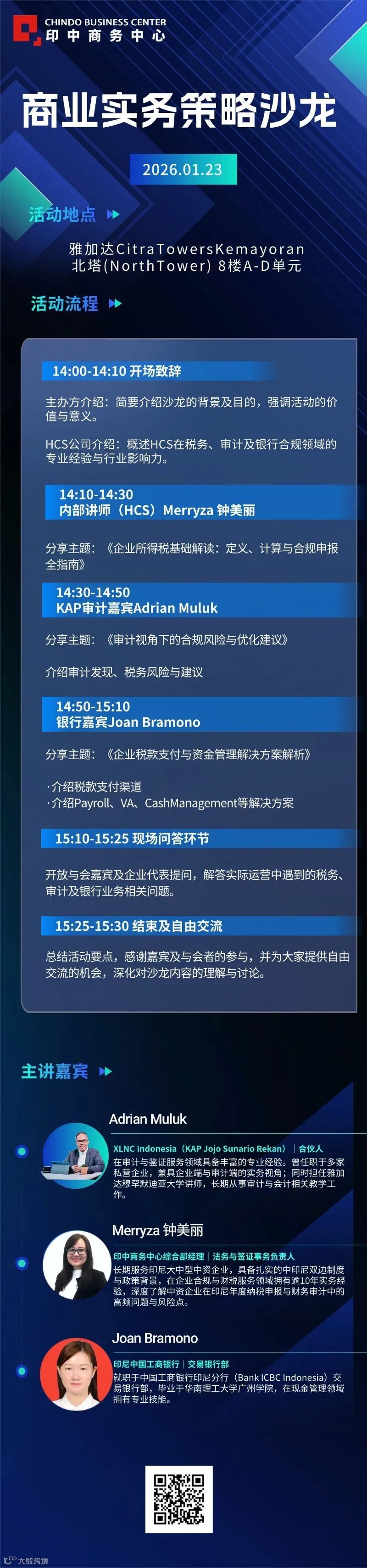 为助力中资企业从战略高度理解合规价值与边界,印中商务中心将于2026年1月23日(周五)14:00–15:30举办“商业实务策略沙龙:企业税务、审计与银行业务”。