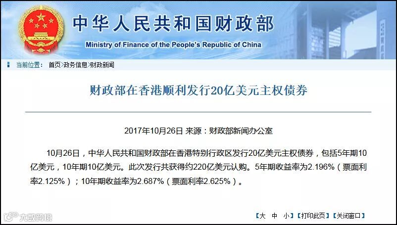 10月26日晚间发布消息,当天财政部在香港特别行政区发行了20亿美元主权债券,包括5年期的10亿美元和10年期的10亿美元。此次发行共获得约220亿美元认购,为计划发行金额20亿美元的十倍。其中,5年期收益率为2.196%(票面利率2.125%);10年期收益率为2.687%(票面利率2.625%)。值得注意的是,这是在没有做第三方评级情况下发行美元债,票面利率均低于预期。