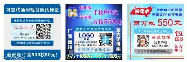 记者在某网购平台输入关键词“二维码防伪”,能搜到近千个相关结果。记者以买家身份与其中几家电商联系,他们表示,除了二维码防伪标识之外,还提供“激光镭射防伪”“温变火烤防伪”“滴水消失防伪”“荧光防伪”等多种市场上较流行的防伪技术服务,并有电话、微信、网络、二维码等多种查询方式。
