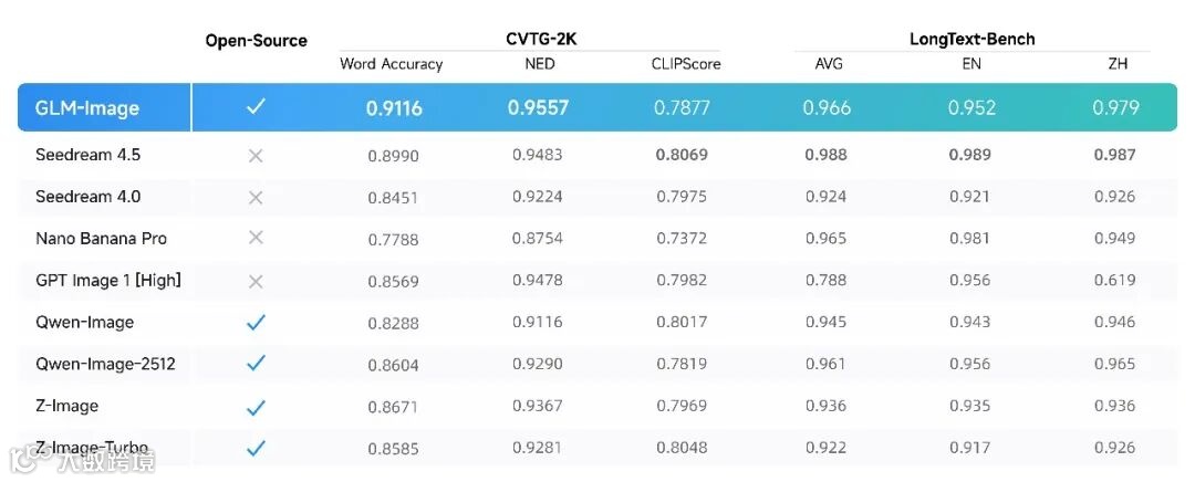 GLM-Image重点突破长文本理解与复杂视觉文字生成任务,在多项开源基准测试中领跑: