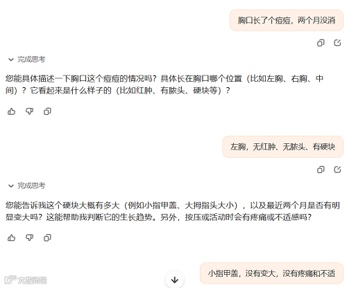 例如,当用户输入“胸口长了个痘痘,两个月没消”这类模糊描述时,缺乏信息收集能力的大模型往往直奔结论,罗列海量相关症状,反而令人无所适从。