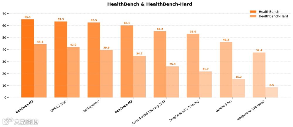 此前,Baichuan-M2曾位列开源模型榜首,仅次于GPT-5;而Baichuan-M3在HealthBench总分上超越GPT-5.2,并在更具挑战性的HealthBench-Hard榜单登顶全球第一,成为当前医疗沟通与推理能力最强的开源医疗大模型。