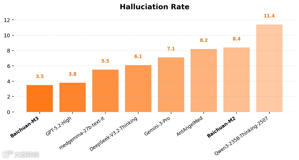 在严肃医疗场景中,“幻觉率”至关重要。DeepSeek当前幻觉率约为6.1%,GPT-5.2-High为3.8%,而Baichuan-M3达3.5%,刷新行业SOTA(State-of-the-Art)水平。
