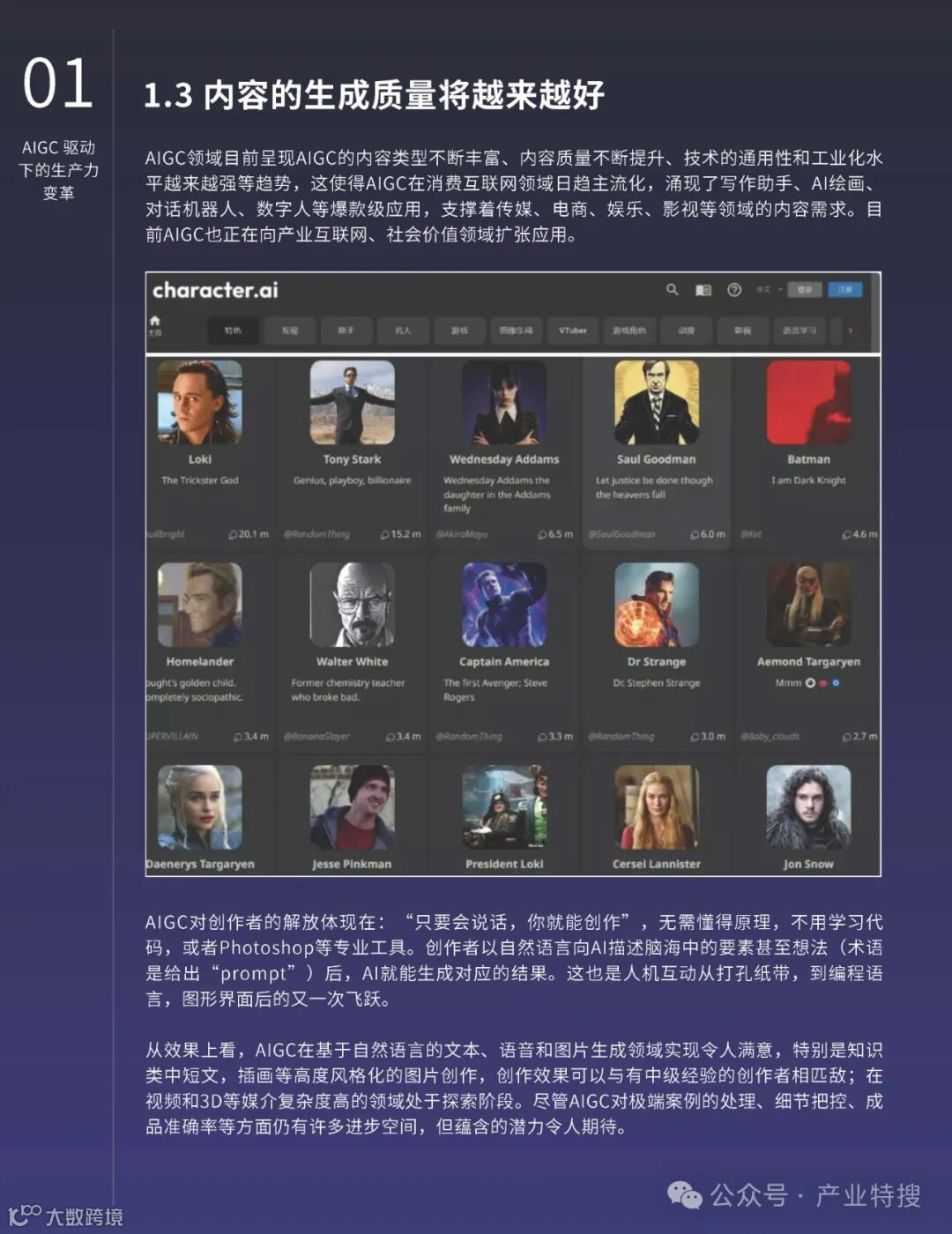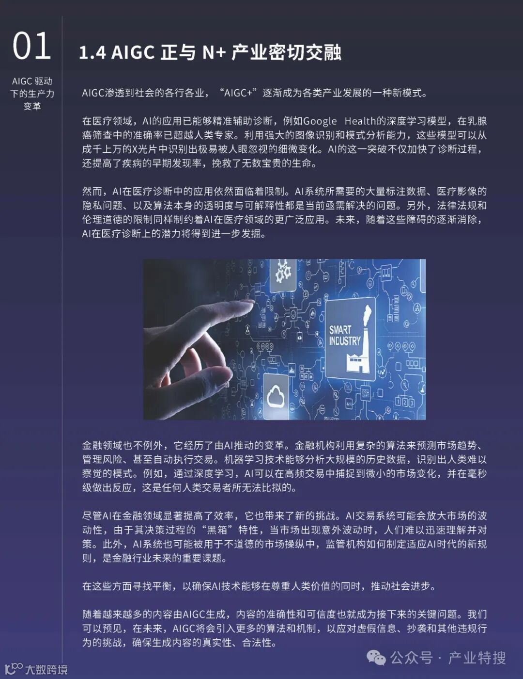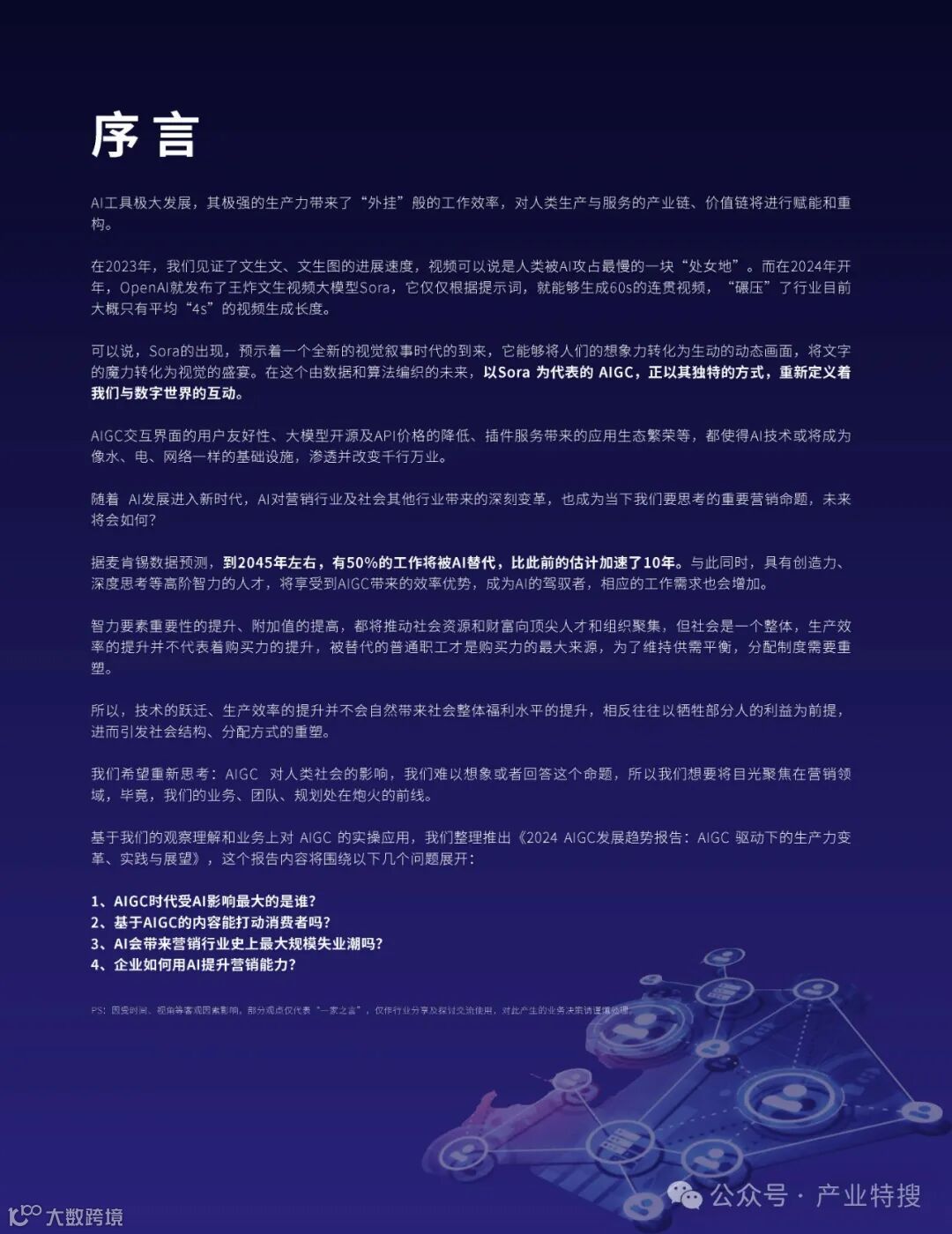 这份文件是一份关于AIGC(人工智能生成内容)发展趋势的报告,主要探讨了AIGC技术如何推动生产力变革、在各行业的应用实践以及未来的展望。以下是报告的核心内容概要:
