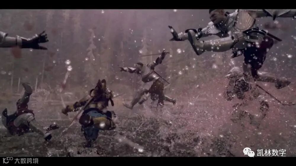 在细节上,AIBerto Mielgo也尽善尽美,小到女妖在湖水里飞溅起的水珠、士兵们的铠甲、水珠撞到铠甲表面的动态,大到整个森林场景的镜头呈现都是实际建模出来的,经过传统的3D打光和渲染,才有如此逼真的视觉效果。