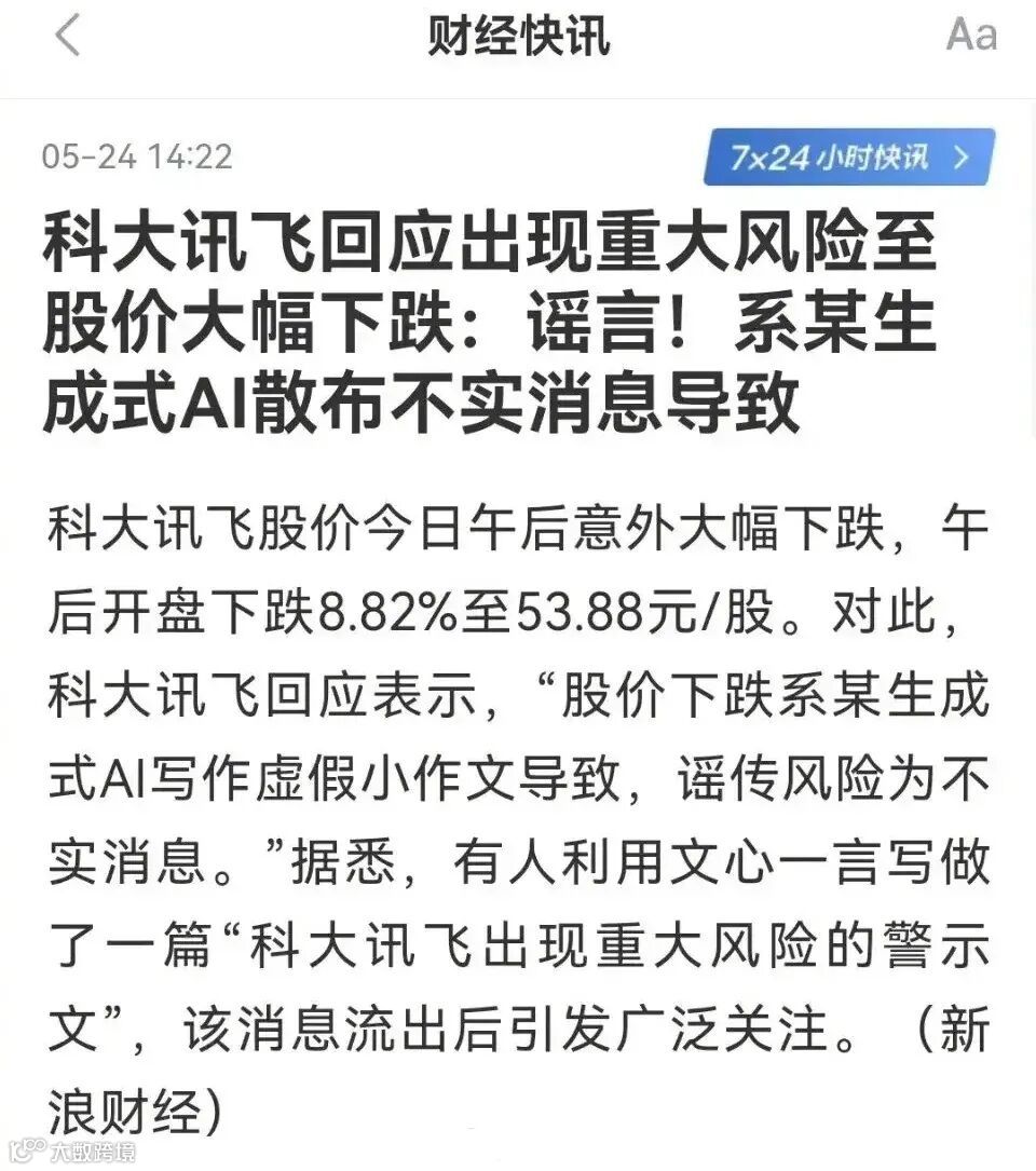 今天看到科大讯飞指责某AI散布不实消息,致使其股价下跌的消息,引发了人们对生成式AI引发的法律责任和监管的讨论。虽然这里面的原因结果、谁对谁错等目前看还不是很清晰,但仅从法律的层面,我的观点是: