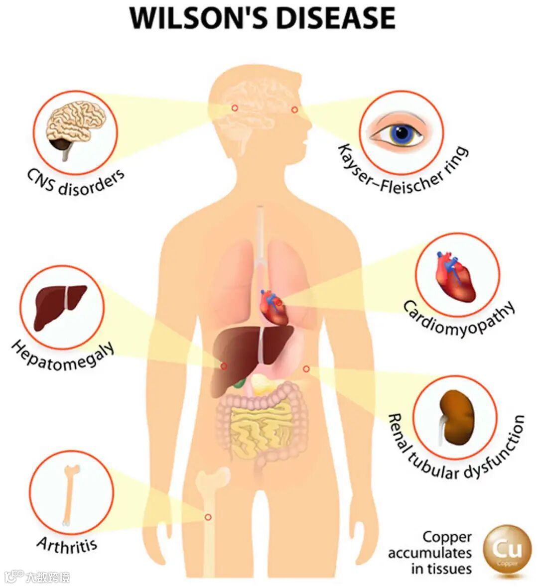 肝豆状核变性(hepatolenticular degeneration,HLD)又称威尔逊氏病(Wilson's Disease,简称WD),是一种常染色体隐性铜代谢遗传性疾病,由位于第13号染色体的 ATP7B 基因突变导致。发病人群常集中在青少年儿童,患者体内铜离子转运及排泄出现障碍,铜在多个脏器大量蓄积,95%以上的患者会出现角膜K-F环,呈现出我们所看到的绿褐色或暗棕色。WD中过量铜在不同的组织器官病理性蓄积,可出现不同的临床表现。