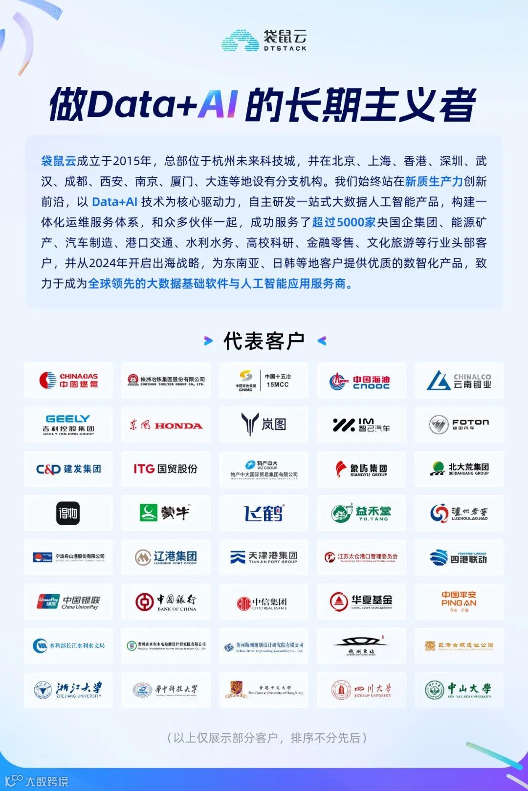 袋鼠云凭借十年的技术沉淀与行业深耕,始终站在新质生产力创新前沿,以 Data+AI 技术为核心驱动力,自主研发一站式大数据人工智能产品,构建一体化运维服务体系,和众多伙伴一起,成功服务了超过5000家央国企集团、能源矿产、汽车制造、港口交通、水利水务、高校科研、金融零售、文化旅游等行业头部客户,并从2024年开始出海战略,为东南亚、日韩等地客户提供优质的数智化产品,致力于成为全球领先的大数据基础软件与人工智能应用服务商。