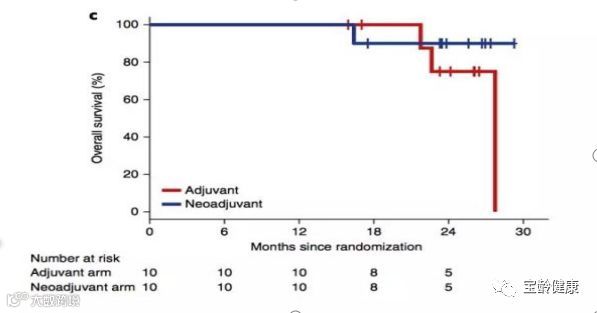 * 新辅助治疗组,30个月无复发生存率(RFS)为80%,总生存率为90%