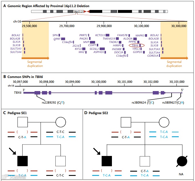 TBX6基因位于16p11.2区域,是T-box家族的成员,编码参与发育过程调控的转录因子,在体节发生过程中发挥重要作用。目前已经明确TBX6基因的复合遗传机制与脊柱肋骨发育不良、脊柱侧弯相关。