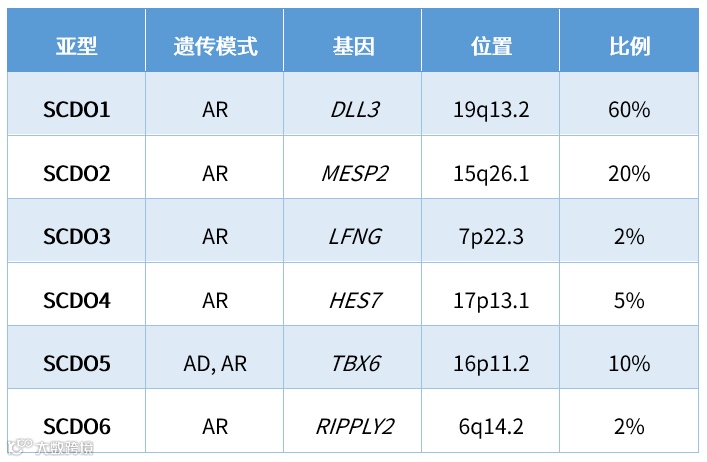 目前OMIM数据库已经收录6个亚型,多以常染色体隐性遗传为主,其中SCDO5相关基因TBX6基因的亚效等位基因常与该基因的致病突变共同作用导致疾病(SCDO5)发生,其中亚效等位基因可能为高频突变(亚洲人中为44%,欧洲人中为33%),这一研究突破了疾病的遗传学研究中占主导地位的“常见变异导致常见疾病”的理论框架,揭示了常见变异与罕见变异共同作用导致疾病发生的新机理。
