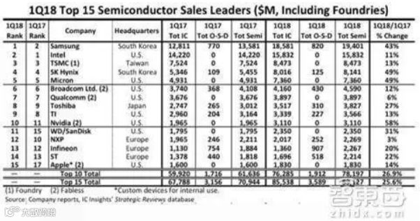 市场研究机构 IC insights 近日发布的调查数据显示,2018 年第一季度,全球营收前十五的半导体厂商中,前三名分别为三星、英特尔、台积电。这十五家厂商中,有八家来自美国、三家来自欧洲、两家来自韩国、台湾和日本各一家。